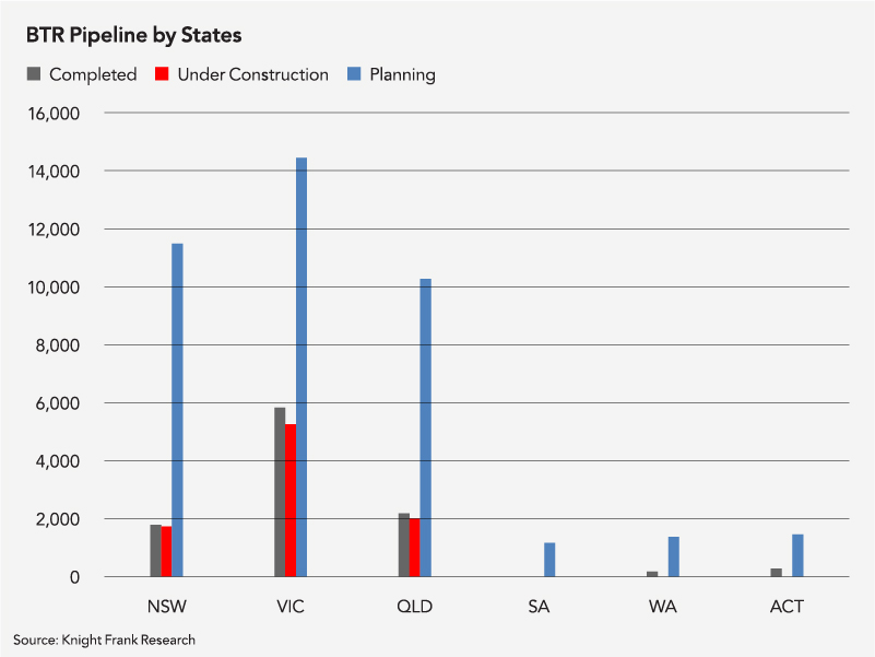 • Consultants BDO estimate the national BTR pipeline includes about 39,300 apartments across 113 projects, worth about $30bn. That represents a growth of 10,000 apartments over the past year. But these decisions to build BTR were made 2 to 3 years ago and new commencements are slowing down this year, largely due to feasibility concerns.